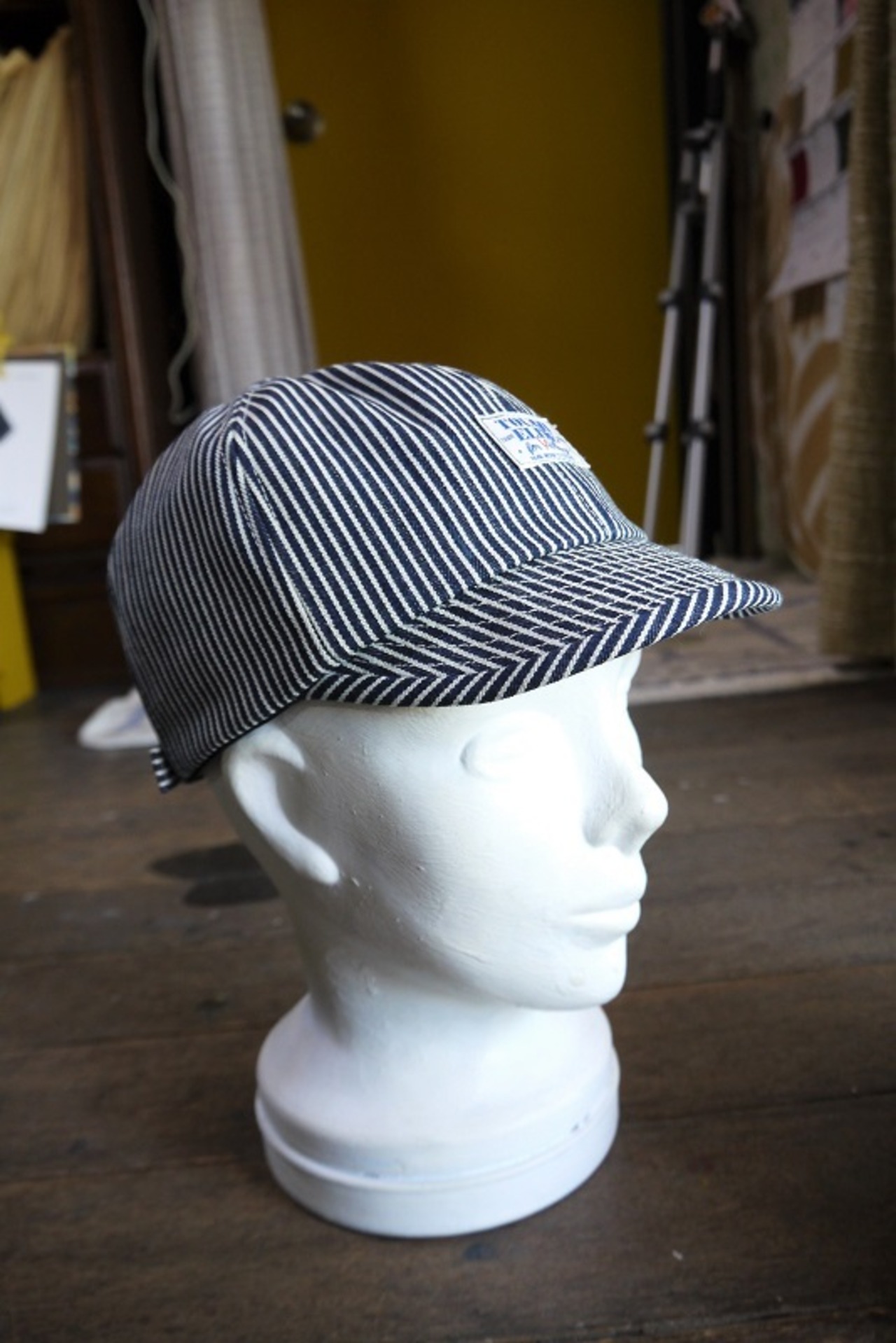 生地は、コットン100% ヒッコリーストライプ 縫製は生成り、フロントには越前織のブランドロゴ、アジャスター横にTMであるカミソリステッチ、キャップ内にユニオンチケットを設けました。