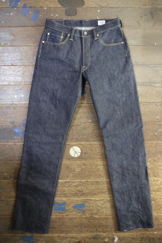 14.5oz 合成インディゴ染め米豪の混合綿を使用。ローテンションにてゆっくり織られた自然な風合いの凹凸ノンウオッシュ生織デニム生地。